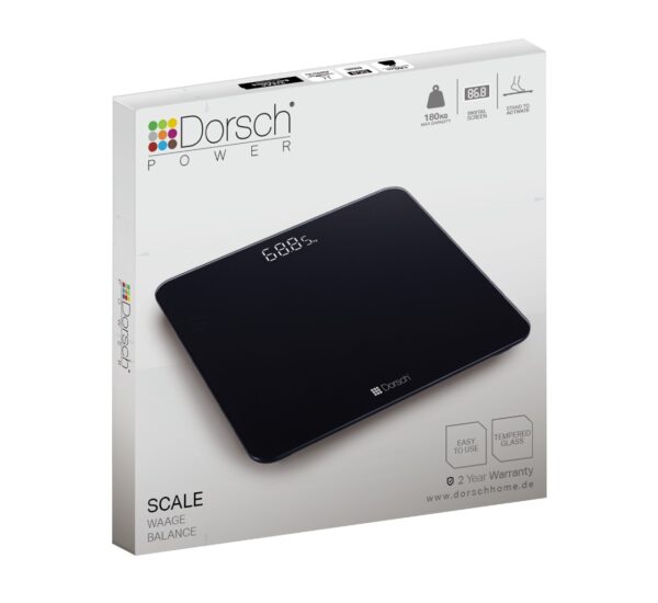 Dorsch Digital Badevægt med stand-to-activate funktion giver præcise og pålidelige målinger med en maksimal kapacitet på 180 kg (396 lbs). Den brugervenlige vægt har et letlæseligt digitalt display og slankt, stilfuldt design, der passer ind i ethvert badeværelse. Drevet af 3xAAA batterier (medfølger ikke).