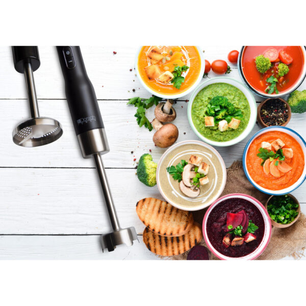 Dorsch Stavblendersæt HB600S med kraftfuld 800W motor og smart speed-teknologi giver præcis kontrol over blendning og piskning. Skaftet i rustfrit stål og ekstra lang drivaksel gør det nemt at nå ned i dybe skåle og gryder. Ergonomisk og blødt greb sikrer komfortabel brug, og alle aftagelige dele er nemme at rengøre. Sættet indeholder stavblender, stativ, grønsagsmoser i rustfrit stål, piskeris, minihakker og 1 liters bægerglas – alt hvad du behøver til alsidig madlavning.